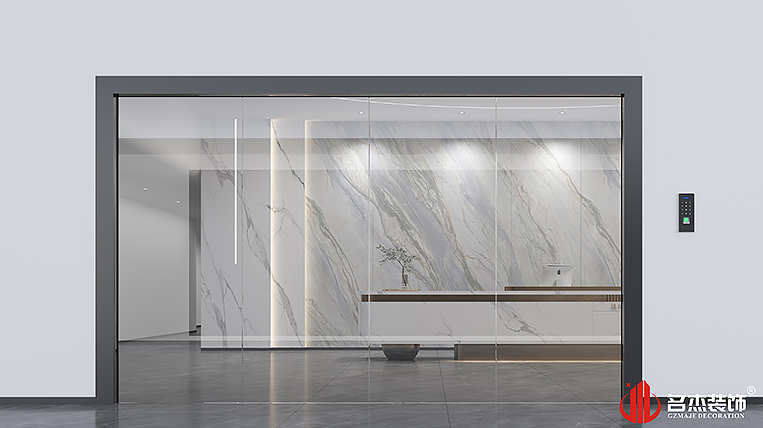 前廳是整個辦公裝修設計空間的一大亮點,前臺背景墻大理石條紋的拼接組合打破了原本傳統的設計,大理石紋路與燈飾的配合,碰撞出了不一樣的火花,加上嵌入燈帶的配合,使整個空間充滿靈動。圓形吊頂也能夠讓空間煥發出不一樣的設計層次感,兩者相互配合,共同打造出一個特別的辦公場景。